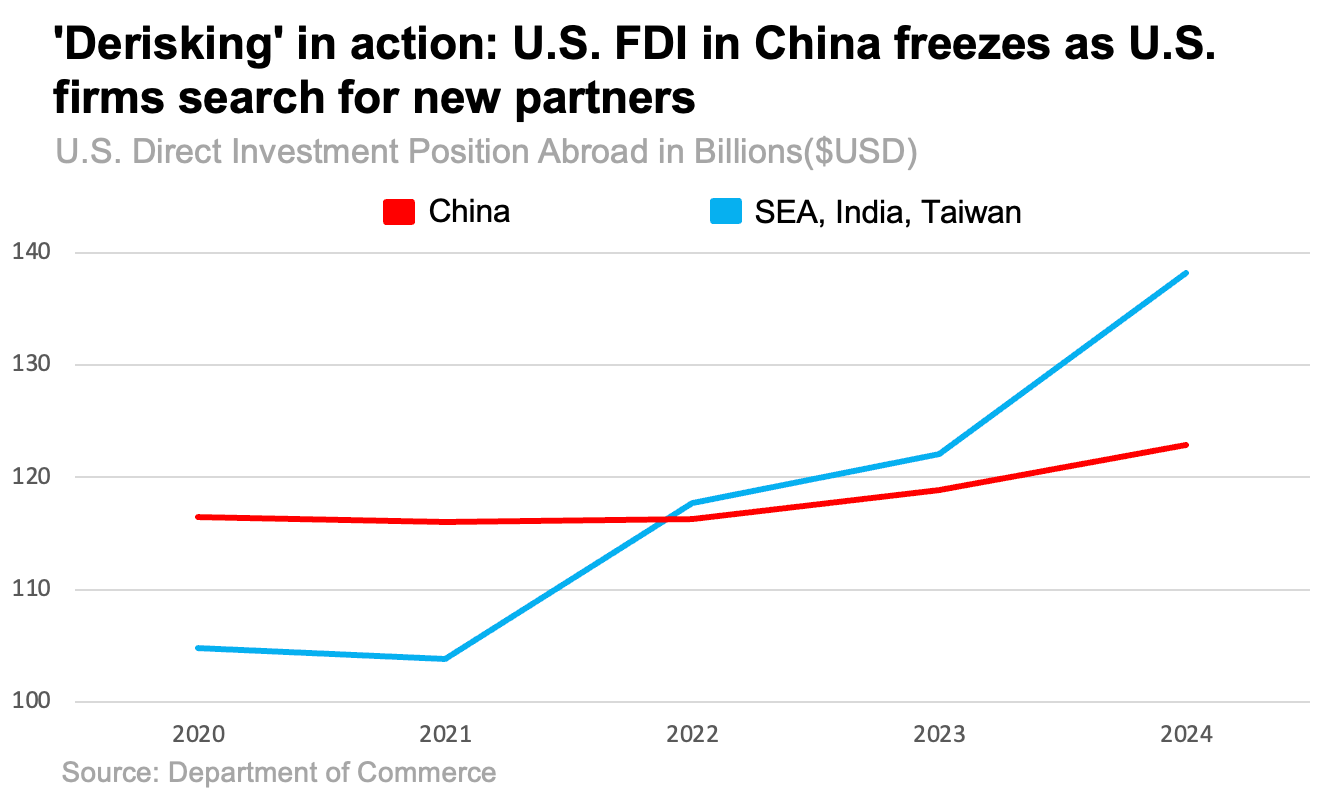 This picture, however common in the financial press, is inaccurate in two ways. The first is that, if looking at U.S. imports of goods with substantial Chinese contribution rather than strictly goods marked as “Made in China”, it’s unclear if the 'Great Divorce' is actually happening. U.S. - Chinese mutual trade dependency has, if anything, only demonstrated its utmost resilience. The second is that Trump's April tariff war is only one part of a much greater and more comprehensive bipartisan decoupling drive dating back to 2018, which encompasses aspects of the U.S. - China relationship beyond just trade. As China's steadily climbing post-Liberation Day export numbers have shocked the commentariat, it only takes one quick look at foreign investment flows into China to see where the change is really happening.